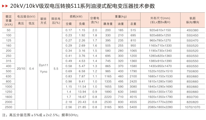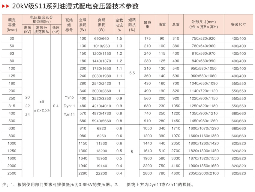 S11系列产品在S9系列的基础上,空载损耗平均降低了30%;空载电流比S9下降70-85%;平均温升降低10K,产品使用寿命增加一倍多,即使在超负载20%的条件下仍可长期运行;产品运行噪音平均降低2-4分贝。