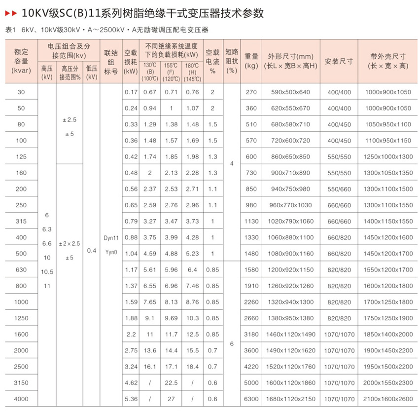 树脂绝缘干式变压器是我公司引进国外先进技术,自主开发了SC9 、SCB9系列以及SC10 、SCB10 系列带填料薄绝缘干式变压器,由于线圈被环氧树脂包封,所以难燃,防火、防爆,免维护,无污染,体积小,可直接安装在负荷中心。同时科学合理的设计和浇注工艺,使产品局部放电量更小,噪声低,散热能力强,在强迫风冷条件下可以在140 %额定负载下长期运行,并配有智能温控仪,具有故障报警,超温报警,超温跳闸以及黑闸子功能,并通过RS485 串行接口与计算机相连,可以集中监视和控制。