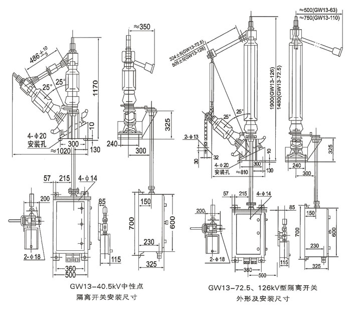 隔离开关由支架、底座、支柱绝缘子、触头、接线板等部分组成。支柱绝缘子及导电部分安装于底座上,两支柱绝缘子交角为50o的支架上。支架上装有与操动机构相连接的轴。可配CS17-G手动操作机构,也可配用CJ6电动机构。
